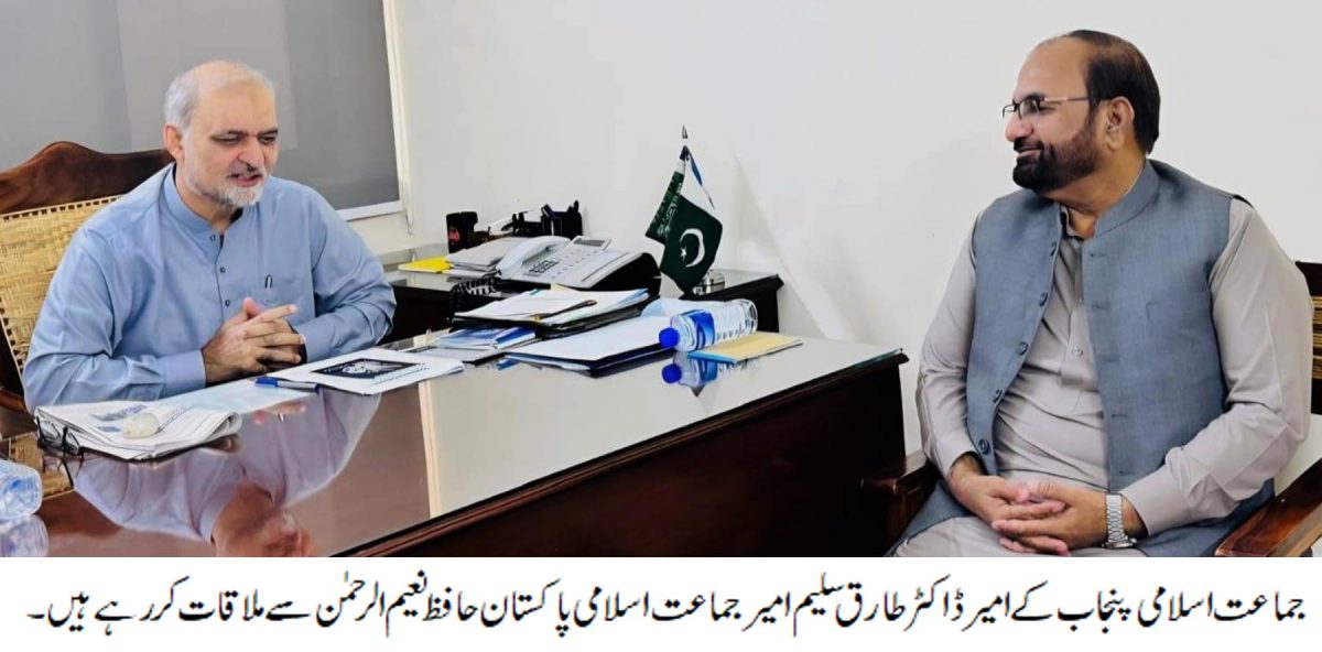 اسلام آباد —— جماعت اسلامی پنجاب کے امیر ڈاکٹر طارق سلیم نے گذشتہ روز امیر جماعت اسلامی پاکستان حافظ نعیم الرحمن سے ان کے دفتر میں ملاقات کی، اس موقع پرڈاکٹر طارق سلیم نے جماعت اسلامی پنجاب شمالی کی دعوتی تنظیمی اور سیاسی سر گرمیوں ممبر سازی مہم، عوامی کمیٹیوں کے قیام،ممبر کنو نشن اور جماعت اسلامی کے کل پاکستان اجتماع عام کے حوالے سے صوبے میں ہو نے والی تیاریوں سے بھی امیر جماعت اسلامی حافظ نعیم الرحمن کو آگاہ کیا، ملاقات میں حافظ نعیم الرحمن نے ملک کی مجموعی سیاسی صورتحال اور جماعت اسلامی کی حکمت عملی کے حوالے سے بھی آگاہ کیا۔