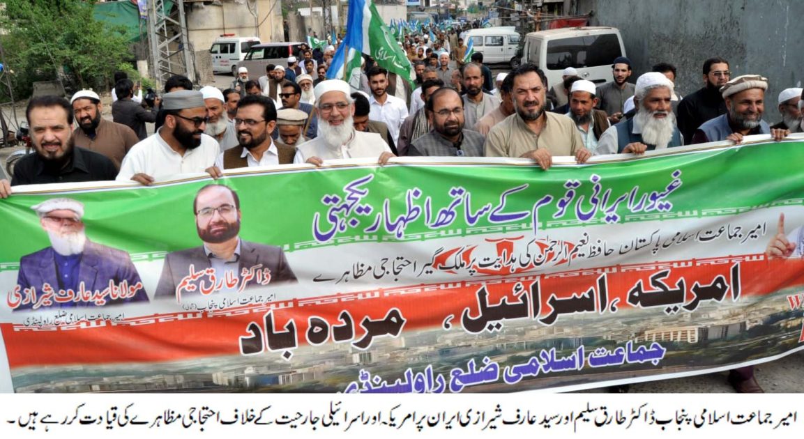اسلام آباد ( ) امیر جماعت اسلامی پاکستان حافظ نعیم الرحمن کی اپیل پر ایرن پر امریکی جارحیت اور آیت اللہ خامنائی کی شہادت کے خلاف ملک بھر کی طر ح جماعت اسلامی پنجاب شمالی کے مختلف اضلاع راولپنڈی،اٹک، مری، چکوال، تلہ گنگ، جہلم، گجرات، منڈی بہاوالدین،سر گودھا، خوشاب، میانوالی اور بھکر میں بھی احتجاجی مظاہرے کیے گئے، امیر جماعت اسلامی پنجاب ڈاکٹر طارق سلیم نے راولپنڈی اور سیکرٹری جنرل اقبال خان نے اٹک میں احتجاجی مظاہروں کی قیادت کی اور شر کا ء سے خطاب کیا۔اس موقع پرامیر جماعت اسلامی ضلع راولپنڈی سید عارف شیرازی اور دیگر ضلعی عہدے داران نے بھی مظاہرین سے خطاب کیا۔شر کا ء سے خطاب کر تے ہو ئے ڈاکٹر طارق سلیم نے کہا ایران پر امریکہ اور اسرائیل کا حملہ کھلی جارحیت اور عالمی دہشتگردی ہے، آیت اللہ علی خامنائی کی شہادت عالم اسلام کیلئے بڑا نقصان ہے،ڈونلڈ ٹرمپ کا ایران میں رجیم چینج اور اعلیٰ ایرانی قیادت کو ٹارگٹ کرنا اس بات کا ثبوت ہے کہ امریکہ عالمی دہشتگردی کا سرغنہ ہے، ڈونلڈ ٹرمپ اور اسرائیلی وزیراعظم نیتن یاہو کو جنگی مجرم قرار دیا جانا چاہیے،امریکہ نے اسرائیل کے ساتھ مل کر ایران پر جنگ مسلط کی ہے اور سیاسی قیادت کونشانہ بنایا ہے جو تاریخ کا سیاہ ترین باب ہے، ٹرمپ نے بین الاقوامی قوانین کی دھجیاں اڑائی ہیں، انھوں نے کہاا گر امریکہ و اسرائیل ایران میں رجیم چینج میں کامیاب ہوگیا تو وہ پاکستان کی سرزمین میں داخل ہو جائیں گے،عالم اسلام کو اپنے مشترکہ دشمن کے خلاف متحد ہونا ہوگا۔آیت اللہ خامنہ ای کی شہادت کا یہ پیغام ہے کہ اگر مسلم حکمران متحد نہ ہوئے تو ایک کے بعددوسرے کی باری آئے گی اور یہ سلسلہ رکے گا نہیں، ڈاکٹر طارق سلیم نے کہا ٹرمپ کو دو بار نوبل پرائز کا نام دینے کی سفارش کرنے والے حکمران قوم سے معافی مانگیں،انھوں نے ایران پر امریکہ و اسرائیل کے حملے اور سپریم لیڈر آیت اللہ خامنہ ای کی شہادت کو بدترین عالمی دہشت گردی قرار دیا اور کہا کہ یہ حملہ صرف ایران پر نہیں بلکہ پاکستان،عالمِ اسلام اور پوری انسانیت پر حملہ ہے۔