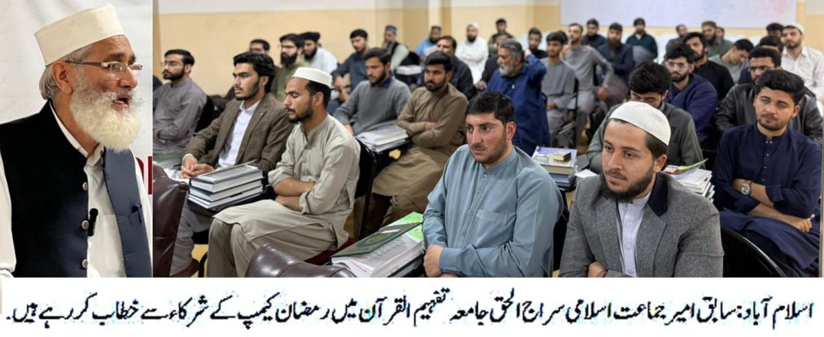 اسلام آباد — سابق امیر جماعت اسلامی سراج الحق نے کہا ہے کہ قرآن کریم کتابِ انقلاب اور لاریب منشورِ حیات ہے۔ قرآن مجید انسان کو یہ درس دیتا ہے کہ زمینی آقاؤں کے سامنے سینہ سپر ہوکر کلمۂ حق بلند کیا جائے۔ ان خیالات کا اظہار انہوں نے جامعہ تفہیم القرآن میں منعقدہ رمضان کیمپ سے خطاب کرتے ہوئے کیا جس میں ملک بھر سے مختلف مکاتب فکر سے تعلق رکھنے والے نوجوانوں نے شریک ہیں۔ اس موقع پر امیر جماعت اسلامی اسلام آباد نصراللہ رندھاوا، سیکرٹری جنرل زبیر صفدر اور ڈائریکٹر جامعہ طیب صدیقی سمیت دیگر ذمہ داران بھی موجود تھے۔ سراج الحق نے کہا کہ قرآن مجید نے انسان کے دل کو مخاطب کیا ہے اور دل کو انسانی زندگی میں مرکزی حیثیت حاصل ہے۔ اگر دل درست ہو تو انسان کی سوچ، کردار اور فیصلے بھی درست سمت اختیار کرتے ہیں، اور اگر دل میں بگاڑ پیدا ہوجائے تو انسان خیر و شر میں تمیز کھو بیٹھتا ہے۔ اسی لیے قرآن دل کی اصلاح، تزکیۂ نفس اور باطن کی پاکیزگی پر زور دیتا ہے تاکہ انسان اللہ کی رضا کے مطابق زندگی گزار سکے۔ انہوں نے کہا کہ رمضان المبارک دراصل دلوں کو منور کرنے، خود احتسابی اور صبر و استقامت کے ذریعے اپنی زندگیوں کو قرآن کی تعلیمات کے سانچے میں ڈھالنے کا مہینہ ہے۔سراج الحق نے نوجوانوں پر زور دیا کہ وہ قرآن و سنت کی تعلیمات کو اپنی زندگیوں کا مرکز بنائیں اور معاشرے میں مثبت تبدیلی کے لیے فعال کردار ادا کریں۔
